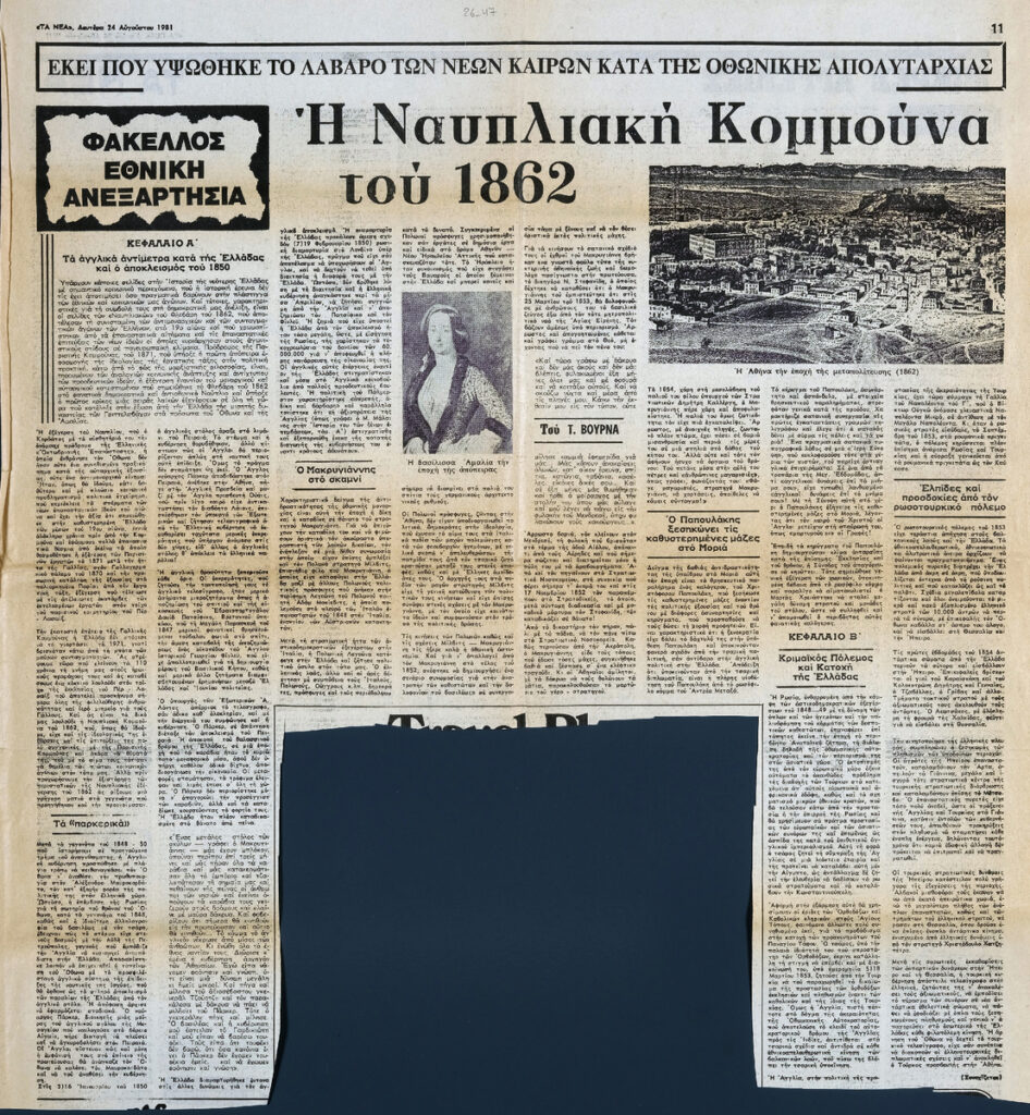 A clipping from the newspaper “Ta Nea”, dated August 24, 1981, featuring an article about the Nafplion uprising in 1862.