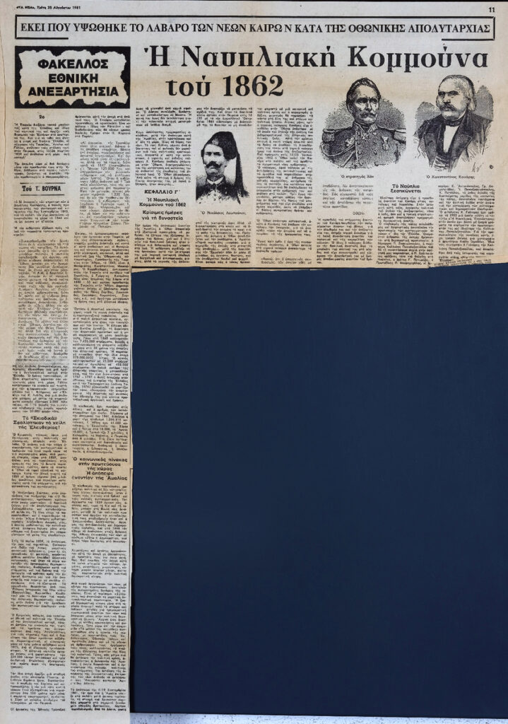 A clipping from the newspaper “Ta Nea”, dated August 25, 1981, featuring a continuation of the ‘s tribute to the Nafplion Commune of 1862. It includes historical data on the uprising in Nafplion.