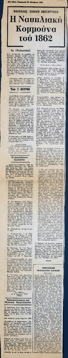 A clipping from the newspaper “Ta Nea”, dated August 28, 1981, featuring a continuation of the ‘s tribute to the Nafplio Commune of 1862. It includes historical data related to the Nafplion uprising.