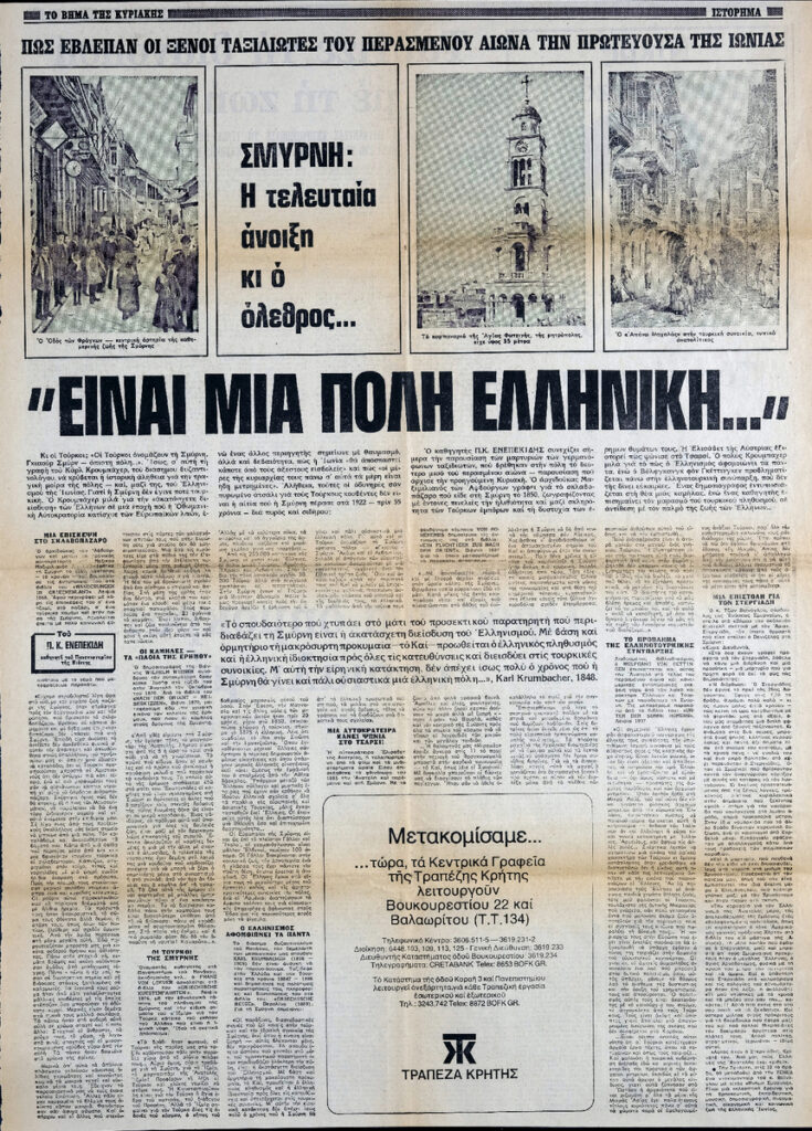 A clipping from the newspaper “To Vima”, dated October 7, 1979, featuring an article that presents testimonies of German-speaking travelers who lived in Smyrna, through excerpts from their books. The dominant Greek element in the city is also commented on.