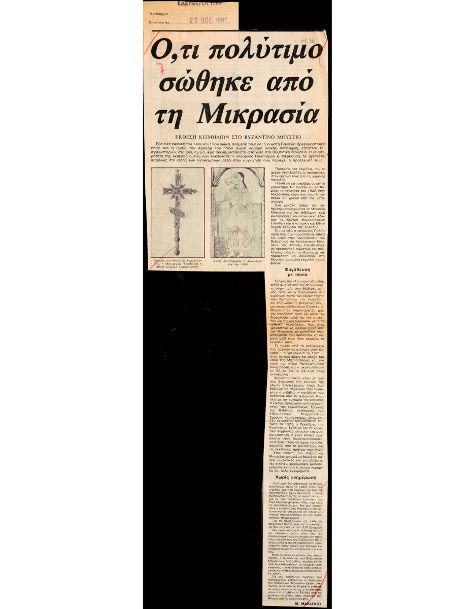 A clipping from the newspaper “Eleftherotypia”, dated November 23, 1982, featuring a review of an exhibition presenting Asia Minor refugee relics held at the Byzantine Museum in Athens.