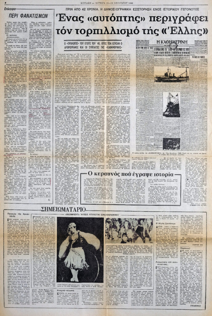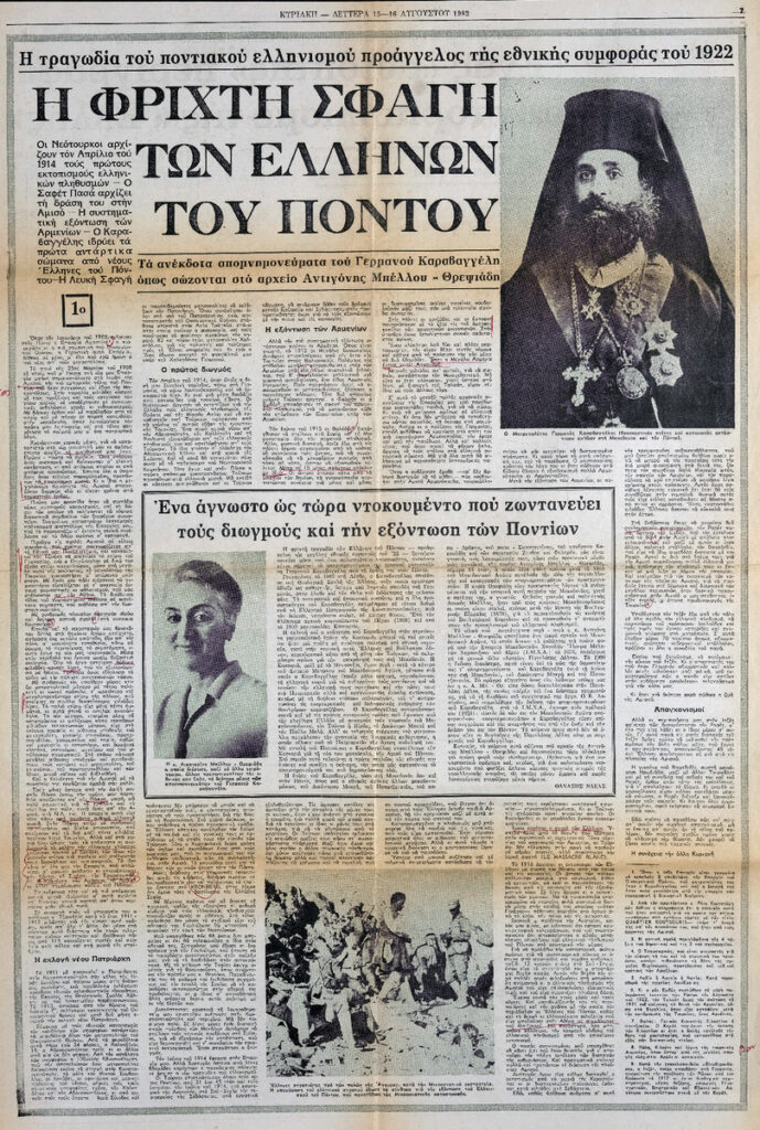 A clipping from the newspaper “I Kathimerini”, dated August 15, 1982, featuring a text by Germanos Karavangelis, in which his personal testimony of the massacre of the Greeks of Pontus by the Turks is conveyed. The text is kept in the archive of Antigoni Bellou-Threpsiadis.