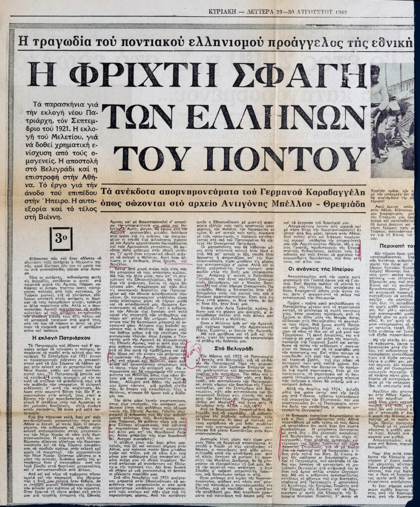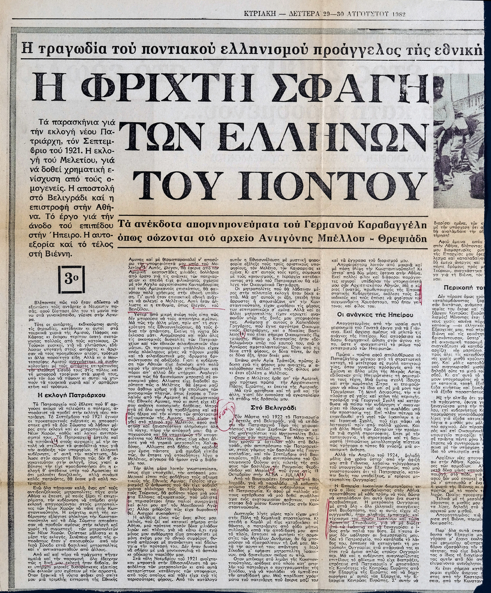 A clipping from the newspaper “I Kathimerini”, dated August 29, 1982, featuring a text by Germanos Karavangelis, in which his personal testimony of the massacre of the Greeks of Pontus by the Turks is conveyed.