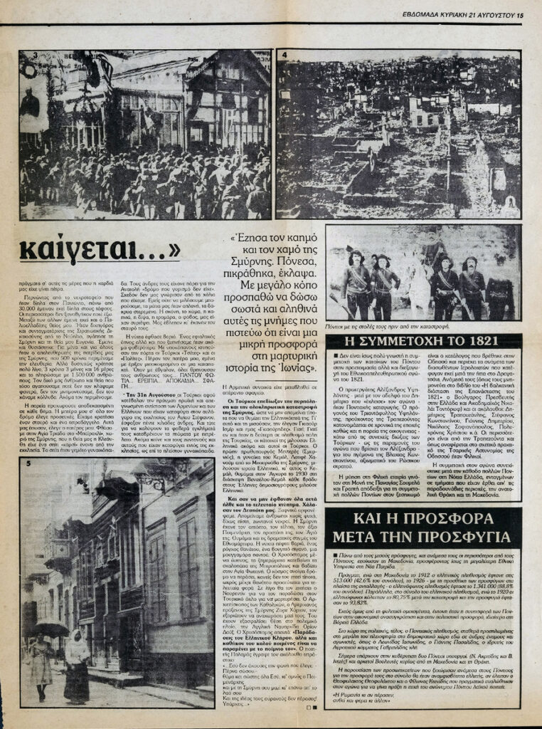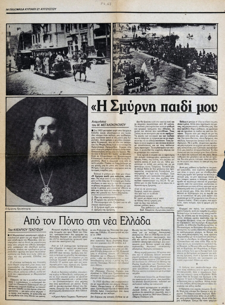 A newspaper clipping, featuring an article about M. Megalokonomos’ recollections of the burning and destruction of Smyrna. The article also discusses the refugee issue. On the same page, there is also an article about the Pontic population in modern Greece.