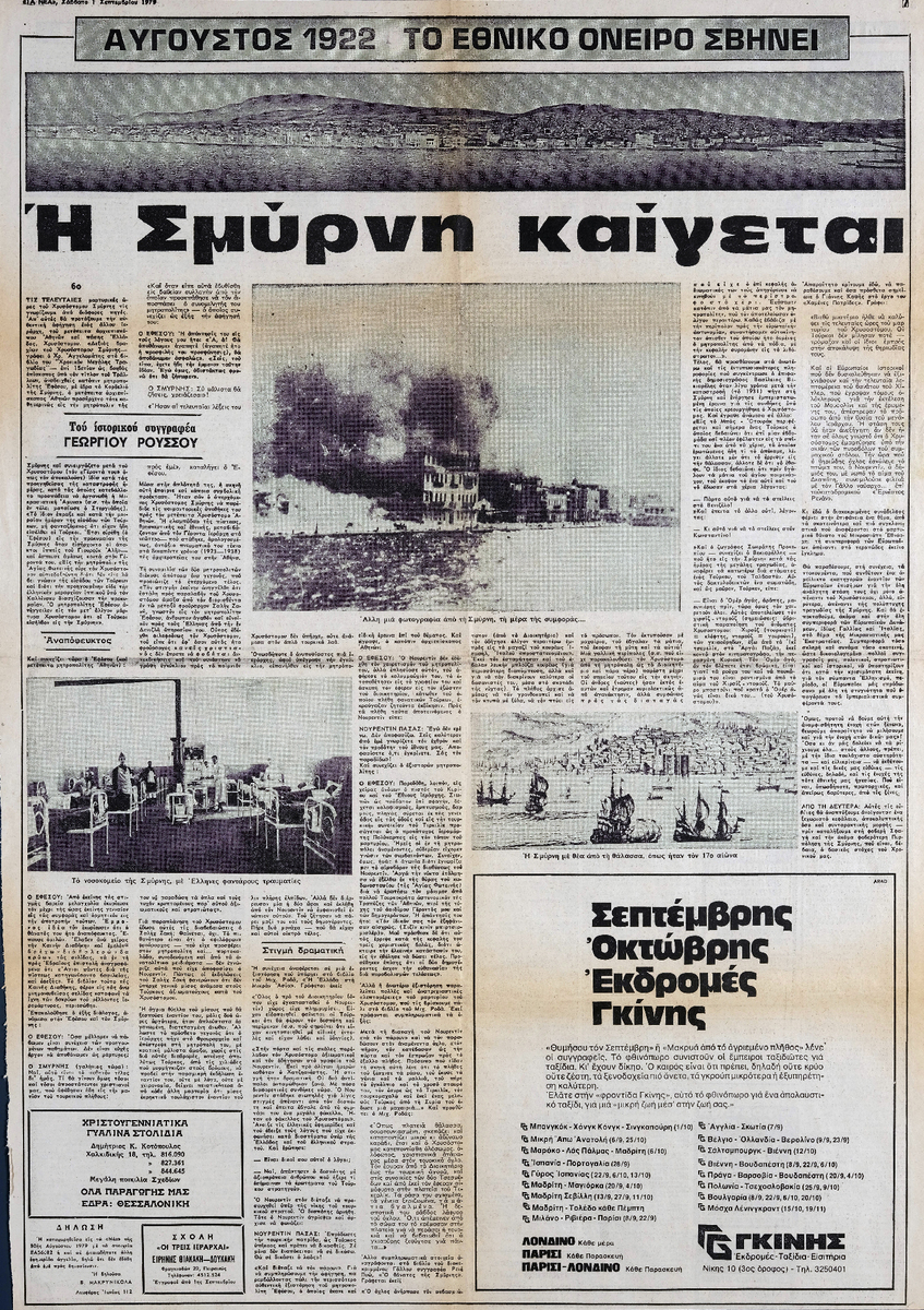 A clipping from the newspaper “Ta Nea”, dated September 1, 1979, featuring an article-testimony about the role of Metropolitan Chrysostomos of Smyrna during the destruction of Smyrna and his brutal death by the Turks. It is included in a dedication of the publication on the subject of the destruction of Smyrna.