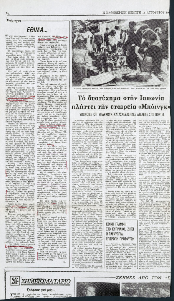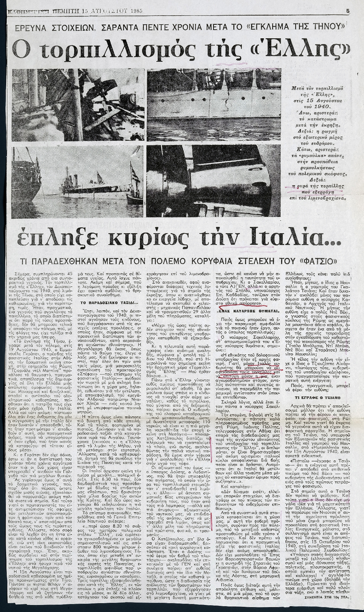 A clipping from the newspaper “I Kathimerini”, dated August 15, 1985.