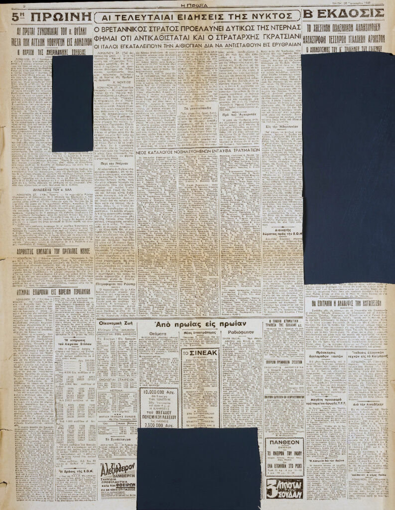 A clipping from the newspaper “I Proia”, dated January 28, 1941, featuring news from the front of the war. On the same page, there is also a prose piece by K. Varnalis titled “Herakles and Dionysus.