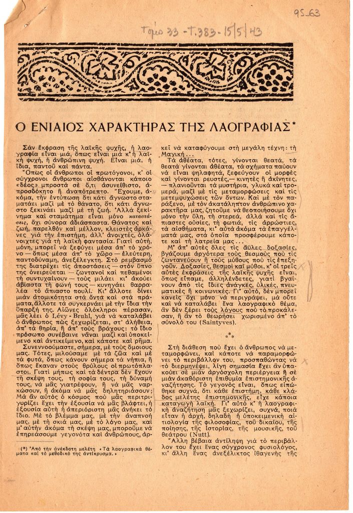 Engonopoulos Nikos (1907 - 1985) ; Kontoglou Fotis (1895 - 1965) ; Hatzikyriakos-Ghika Nikos (1906 - 1994) ; Papaloukas Spyros (1892 - 1957) ; Asteriadis Aghinor (1898 - 1977) ; Theofilos (Chatzimichail) (24/03/1934) ; Sochos Antonios (1888 - 1975) ; Pikionis Dimitris (1887 - 1968) ; Christidis Sotiris (1858 - 1940) ; Δημήτριος Μωρέττης ; Κωνσταντίνος Δοξιάδης ; Αλεξάνδρα Πασχαλίδη ; Γ. Γιαννουλέλης ; Γ. Βαλάτας ; Π. Χατζόπουλος