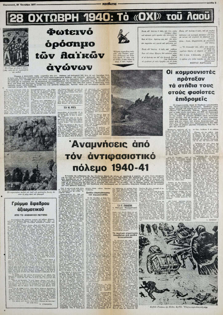 A clipping from the newspaper “Rizospastis”, dated October 28, 1977, featuring a special report on the national anniversary of October 28, 1940. It includes the articles: “Memories from the Anti-Fascist War 1940-41,” “The Communists Bravely Faced the Fascist Invaders.”