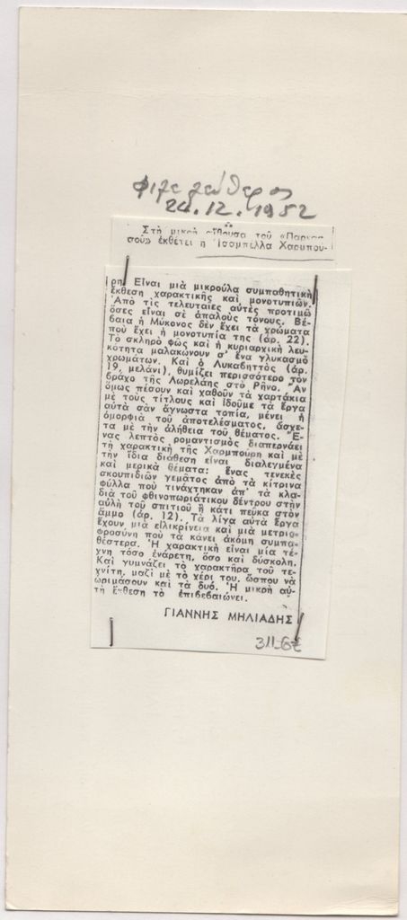 Photocopy of a newspaper clipping, in Greek, on paper, attached to a cardboard surface, 10 × 5 cm. Review by Giannis Miliadis of Isabella Harmbouri’s solo printmaking exhibition in Athens