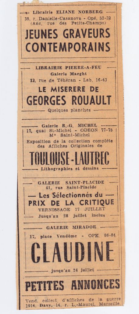Charles Lapicque ; Henri de Toulouse-Lautrec (1864 - 1901) ; Georges Rohner ; Bernard Rancillac ; Bernard Buffet (1928 - 1999) ; Mark Brusse (1937) ; René Bertholo (1935 - 2005) ; Falcou ; Roy Adzak (1927 - 1987) ; Camacho, Jorge (1934 - 2011) ; Gérard Gasiorowski ; Jules Tristani ; Peter Klasen ; Madeleine Luka ; François Aubrun (1934 - 2009) ; Michel Rovelas ; Paul C. Gadala ; Konrad Klapheck