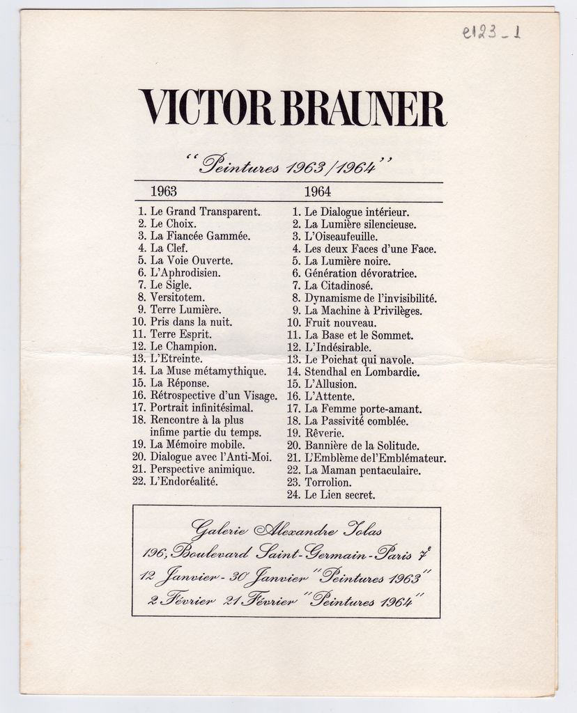 Miro Joan (1893 - 1983) ; Dali Savador (1904 - 1989) ; André Breton (1896 - 1966) ; Max Ernst (1891 - 1976) ; Henri Matisse (1869 - 1954) ; André Parinaud ; Magritte René (1898 - 1967) ; André Masson (1896 - 1987) ; Mondrian Piet (1872 - 1944) ; Jean Piaubert (1900 - 2002) ; Francis Gruber ; Victor Brauner (1903 - 1966) ; Seurat Georges (1859 - 1891) ; Chagal Marc (1887 - 1985) ; Maurice de Vlaminck (1876 - 1958) ; De Chirico Giorgio (1888 - 1978) ; Jean Dubuffet (1901 - 1985) ; Derain Andre (1880 - 1954) ; Jean Dufy ; Julien Tanguy