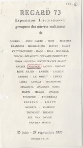 Ioannou Giorgos (1926 - 2017) ; Dali Savador (1904 - 1989) ; Ljuba Popović ; Lurçat Jean (1892 - 1966) ; Felix Labisse ; Magritte René (1898 - 1967) ; Constant Permeke ; Cesare Peverelli ; Bernard Buffet (1928 - 1999) ; Paul Delvaux ; Tsuguharu Foujita ; Edouard Leon Theodore Mesens ; Hans Bellmer (1902 - 1975) ; Oscar Dominguez ; Helmut Leherb ; Suzanne van Damme ; Andreu ; Ensor James (1860 - 1949) ; Dado ; Alberto Biasi (1937) ; Pierre-Yves Tremois ; Anto Carte (1886 - 1954) ; Claus ; Paul Jordan ; Marcel Delmotte ; Enrico Brandani (1914 - 1979) ; Franz Priking ; Eric Brusselmans (1884 - 1953) ; Rene Julien ; Georges Creten ; Danielle ; Pol Mara ; Roland Delcol ; Yves Rhaye ; Lucien Franck ; Haine ; John Hauser ; Jannin ; Laloux ; Christian Le Moult ; Lincke ; Mackowiak ; Auguste Mambour ; Marti ; Paulus ; Saverys ; Ferdinard Schirren ; Louis Thevenet ; Andries Van den Abeele