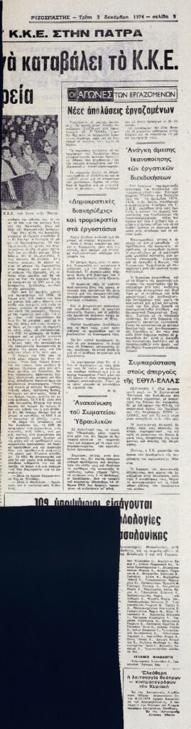 Clipping from the newspaper “Rizospastis”, dated December 3, 1974.