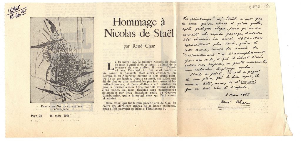 Picasso Pablo (1881 - 1973) ; Miro Joan (1893 - 1983) ; Moulin Raoul-Jean (1934 - 2014) ; René Char ; Giacometti Alberto (1901 - 1966) ; Jacques Dupin