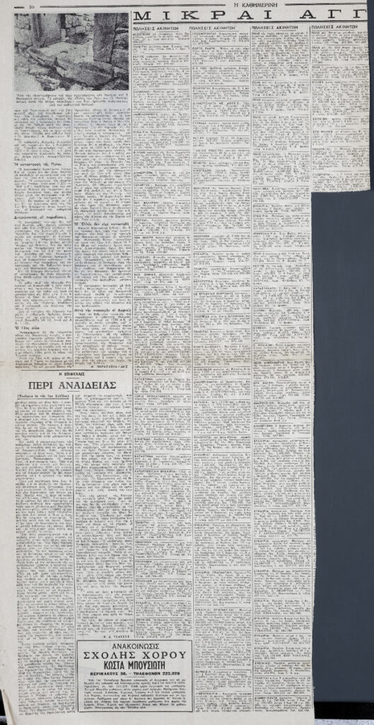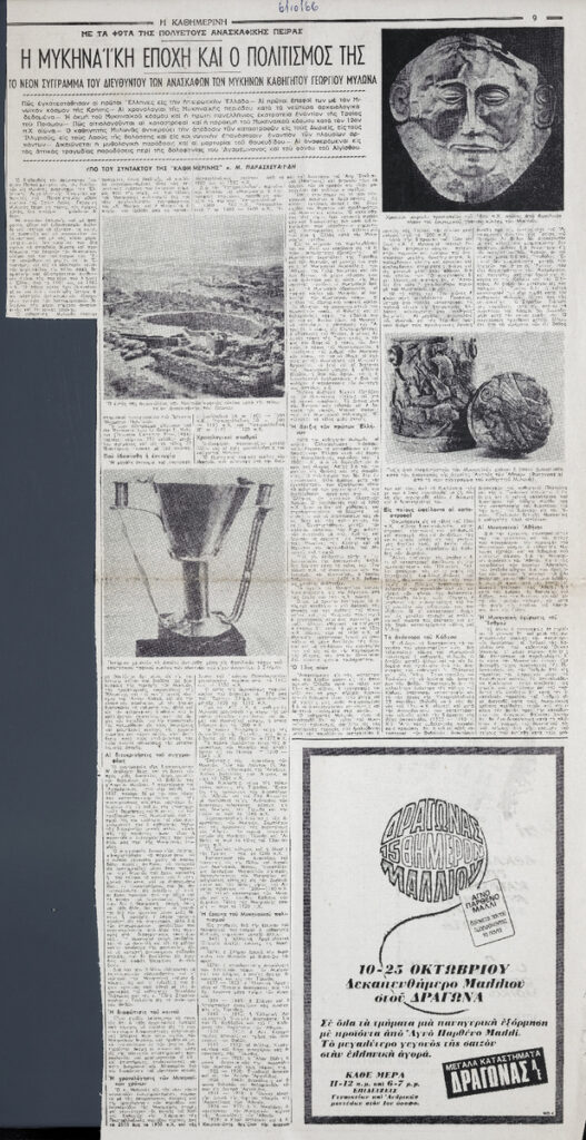 A clipping from the newspaper “I Kathimerini”, dated October 6, 1966, featuring an article about a new book by archaeologist Georgios Mylonas on the Mycenaean era.