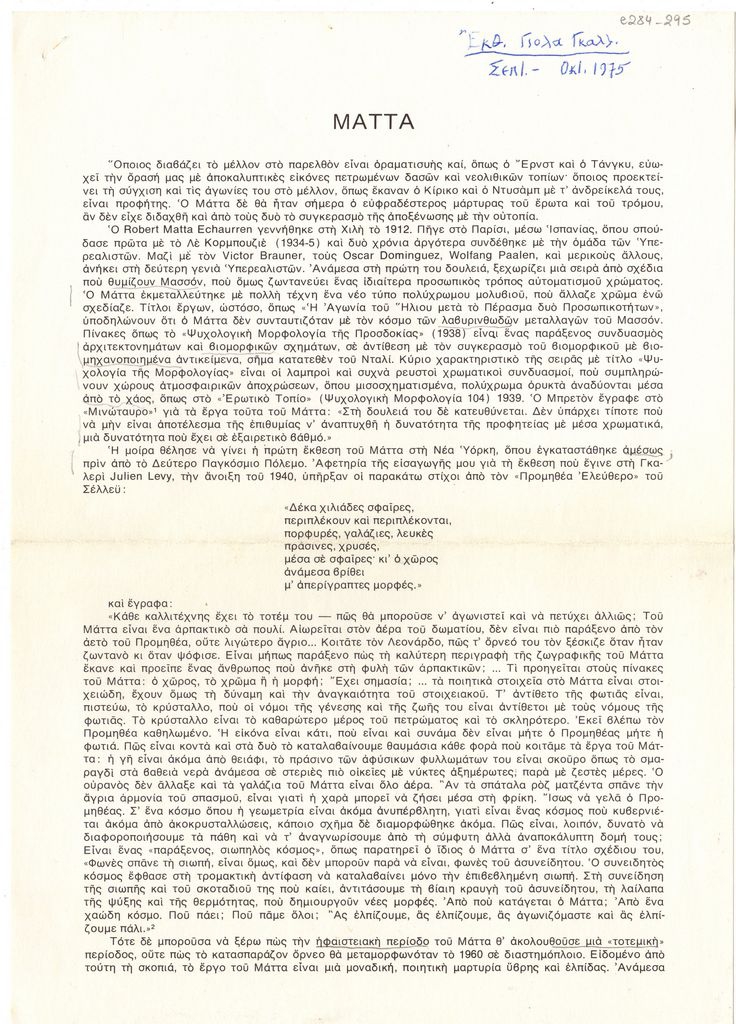 Roberto Matta (1911 - 2002) ; Dali Savador (1904 - 1989) ; Hatzikyriakos-Ghika Nikos (1906 - 1994) ; Calder Alexander (1898 - 1976) ; Moralis Yannis (1916 - 2009) ; Pavlos (Dionyssopoulos) (1930 - 2019) ; Fassianos Alekos (1935 - 2022) ; Tsoclis Costas (1930) ; Max Ernst (1891 - 1976) ; Man Ray (1890 - 1976) ; Mimmo Rotella ; Claude Lalanne ; Στήβεν Αντωνάκος (1926 - 2013) ; Arman (1928 - 2005) ; Saint Phalle Niki de (1930 - 2002) ; Takis (Vassilakis Panayiotis) (1925 - 2019) ; Rauschenberg Robert (1925 - 2008) ; Nicolas Schöffer ; Miguel-Ortiz Berrocal (1933 - 2006) ; De Chirico Giorgio (1888 - 1978) ; Roger Bezombes (1913 - 1994) ; Achilleas Droungas (1940) ; Niki Kanagini (1933 - 2008) ; Kessanlis Nikos (1930 - 2004) ; Kokkinides Demosthenes (1929 - 2020) ; Yaacov Agam (1928) ; Karel Appel (1921 - 2006) ; Gundrun von Leitner ; Γ. Μιχαλέα ; Jacqueline Badord (1917 - 2013) ; Enrico Donati ; Νικολάου