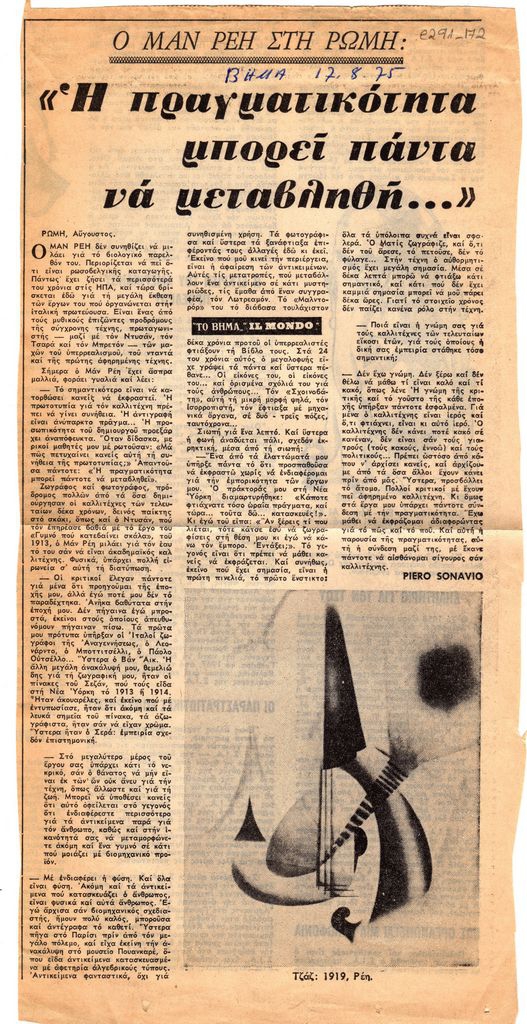 Roberto Matta (1911 - 2002) ; Dali Savador (1904 - 1989) ; Hatzikyriakos-Ghika Nikos (1906 - 1994) ; Calder Alexander (1898 - 1976) ; Moralis Yannis (1916 - 2009) ; Pavlos (Dionyssopoulos) (1930 - 2019) ; Fassianos Alekos (1935 - 2022) ; Tsoclis Costas (1930) ; Max Ernst (1891 - 1976) ; Man Ray (1890 - 1976) ; Mimmo Rotella ; Claude Lalanne ; Στήβεν Αντωνάκος (1926 - 2013) ; Arman (1928 - 2005) ; Saint Phalle Niki de (1930 - 2002) ; Takis (Vassilakis Panayiotis) (1925 - 2019) ; Rauschenberg Robert (1925 - 2008) ; Nicolas Schöffer ; Miguel-Ortiz Berrocal (1933 - 2006) ; De Chirico Giorgio (1888 - 1978) ; Roger Bezombes (1913 - 1994) ; Achilleas Droungas (1940) ; Niki Kanagini (1933 - 2008) ; Kessanlis Nikos (1930 - 2004) ; Kokkinides Demosthenes (1929 - 2020) ; Yaacov Agam (1928) ; Karel Appel (1921 - 2006) ; Gundrun von Leitner ; Γ. Μιχαλέα ; Jacqueline Badord (1917 - 2013) ; Enrico Donati ; Νικολάου