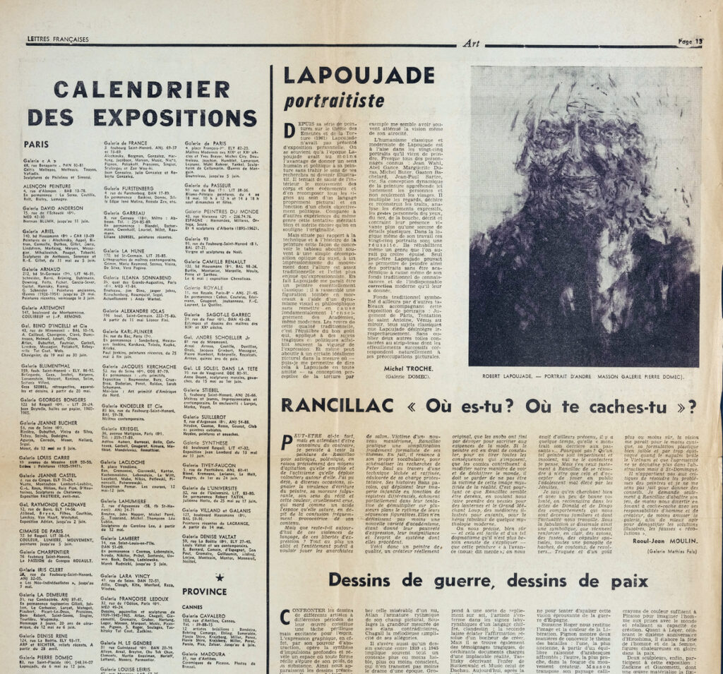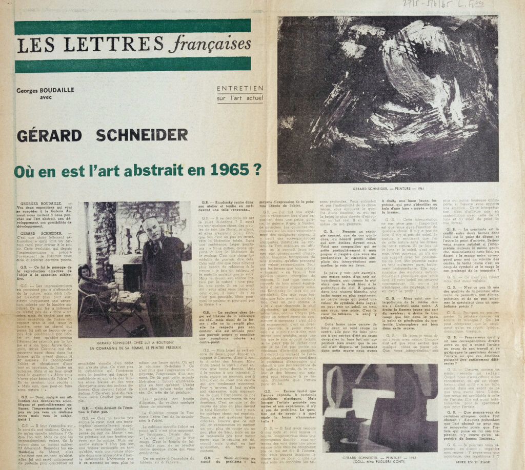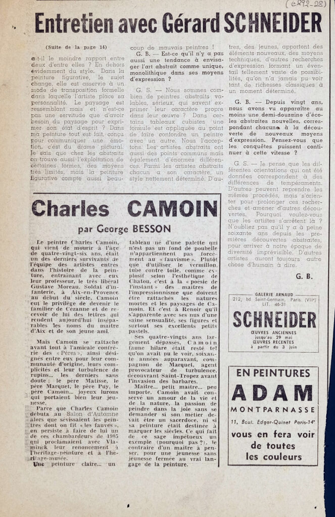 Boudaille Georges (1925 - 1991) ; Spiteris Tonis (1910 - 1986) ; Jacques Michel ; Michel Hoog ; Francis Spar ; Michel Fare ; Gerald Gassiot-Talabot ; André Parinaud ; Roger van Gindertael ; Jean-Dominique Rey ; Jean-Albert Cartier ; Henri-Georges Adam (1904 - 1967) ; Jeanine Warnod ; Genevieve Bonnefoi ; John Ashberry (1927 - 2017) ; Henri Perruchot ; Jean-Clarence Lambert ; Edmond-Henri Humeau ; Jean Gallotti ; Seres Franco ; Jean Adhémar (1908 - 1987) ; Friedrich Bayl ; Georges Duthuit ; Annette Michelson ; Jeanine Lipsi ; Damián Carlos Bayón (1915 - 1995) ; Madeleine Fuchs ; Marina Grey ; Charles Wentinck