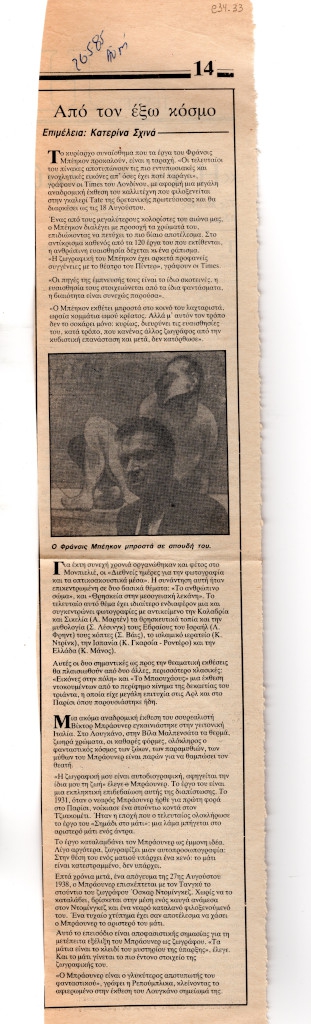 Spiteri-Veropoulou Ioanna (1920 - 2000) ; Vassiliou Spyros (1902 - 1985) ; Michalis Tompros (1889 - 1974) ; Rene Deroudille ; Τέρψη Κυριακού (1916 - 1993) ; Tsoclis Costas (1930) ; Sklavos Yerassimos (1927 - 1967) ; Mylonas Alex (1923 - 2016) ; Gaitis Yannis (1923 - 1984) ; Karas Christos (1930 - 2023) ; Francis Bacon (1909 - 1992) ; Villon Jacques (1875 - 1963) ; Parandinos Nikolaos (1910 - 1991) ; Alberto Burri (1915 - 1995) ; Μανώλης Πιλαδάκης (1927) ; Claude Santa