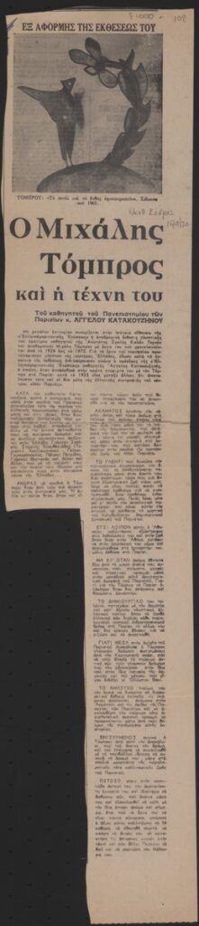 A clipping from the newspaper “Eleftheros Cosmos”, dated April 16, 1972, featuring an article about the Greek sculptor Michalis Tompros, on the occasion of a retrospective exhibition at the Hellenic American Association.