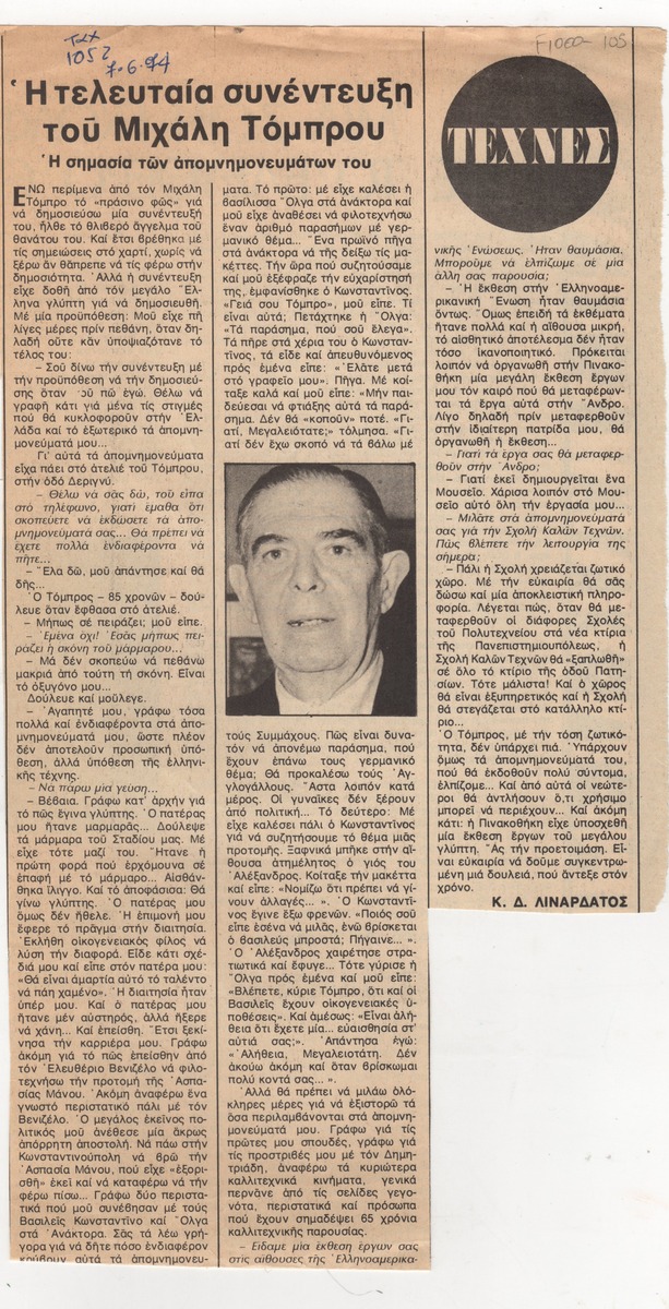 A clipping from the magazine “O Taxydromos”, issue 1052, dated June 7, 1974, featuring the last interview given by the Greek sculptor.