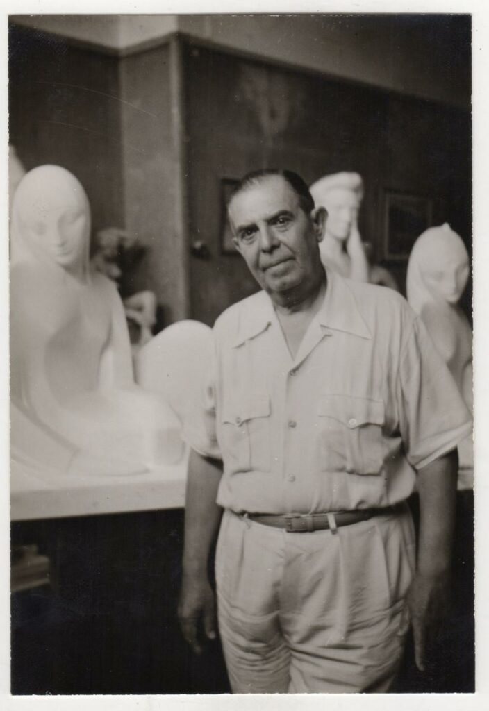 Black-and-white photograph of the sculptor Michalis Tombros. On the reverse, handwritten inscriptions