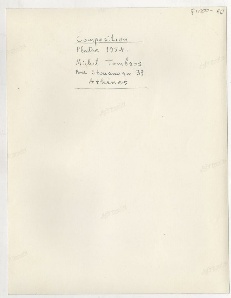 Black-and-white photograph of the sculptor Michalis Tombros. On the reverse, handwritten inscriptions