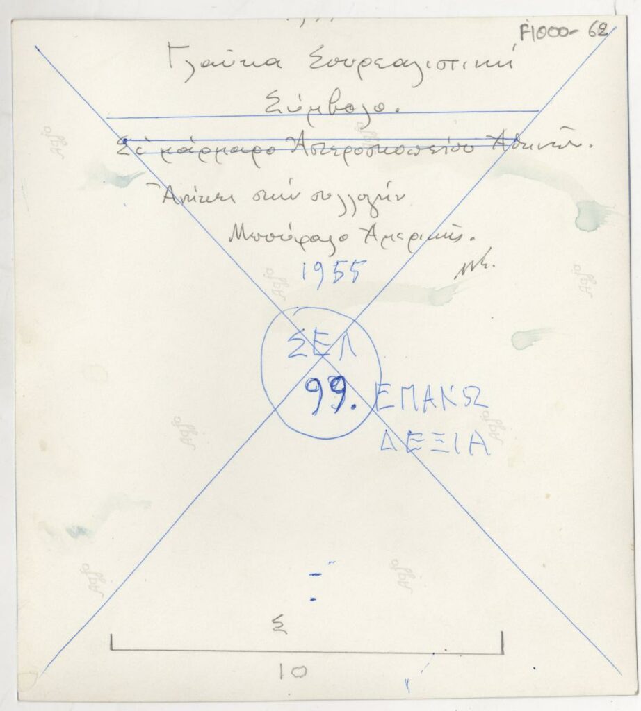Black-and-white photograph of the sculptor Michalis Tombros. On the reverse, handwritten inscriptions