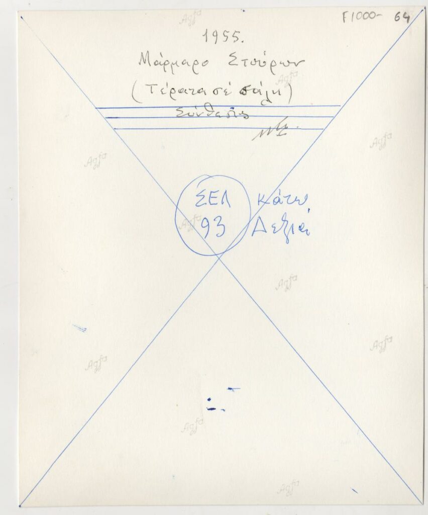 Black-and-white photograph of the sculptor Michalis Tombros. On the reverse, handwritten inscriptions