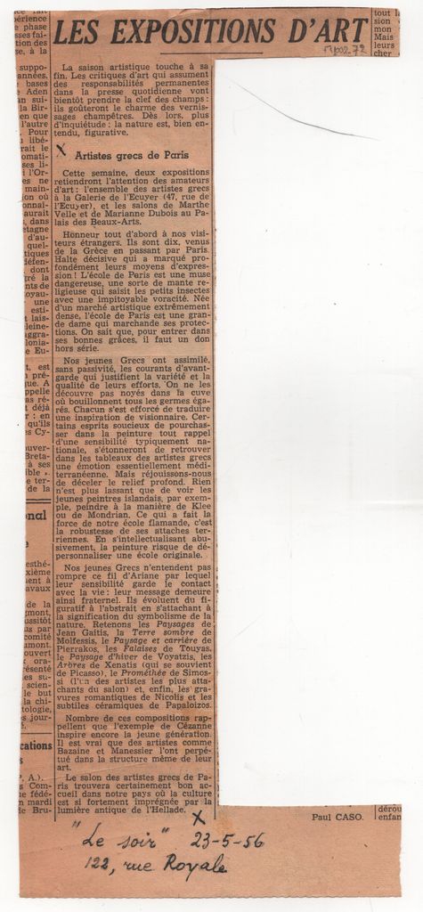 Andreou Kostas (1917 - 2007) ; Fatouros Dimitris (1928 - 2020) ; Spiteri-Veropoulou Ioanna (1920 - 2000) ; Eugène Delacroix (1798 - 1863) ; Giorgos Touyas (1922 - 1994) ; Simossi Gabriela (1926 - 1999) ; Tsoclis Costas (1930) ; Sklavos Yerassimos (1927 - 1967) ; Άγγελος Αγγελόπουλος (1904 - 1995) ; Kontopoulos Alekos (1904 - 1975) ; Mylonas Alex (1923 - 2016) ; Vyzantios Ntikos (1924 - 2007) ; Berto Lardera ; Valsamis Kostas (1908 - 2003) ; Gaitis Yannis (1923 - 1984) ; Le Corbusier (1887 - 1965) ; Georges Mathieu (1921 - 2012) ; Theodoros (Papadimitriou) (1931 - 2018) ; Takis (Vassilakis Panayiotis) (1925 - 2019) ; Victor Vasarely ; Philolaos (Tloupas) (1923 - 2010) ; Kessanlis Nikos (1930 - 2004) ; Kriezi Tita (1930 - 2021) ; Lyberaki Aglaia (1923 - 1985) ; Maltezos Yannis (1915 - 1987) ; Molfesis Iasson (1925 - 2009) ; Paniaras Kostas (1934 - 2014) ; Karras Kostas (1936 - 2012) ; Γιώργος Βαφειάδης