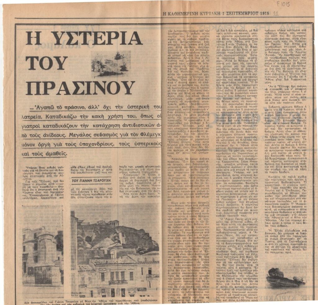 A newspaper clipping, dated September 7, 1975, featuring a text by Yannis Tsarouchis, regarding the color “Green” and the Greeks’ mistaken relationship and impression of it.