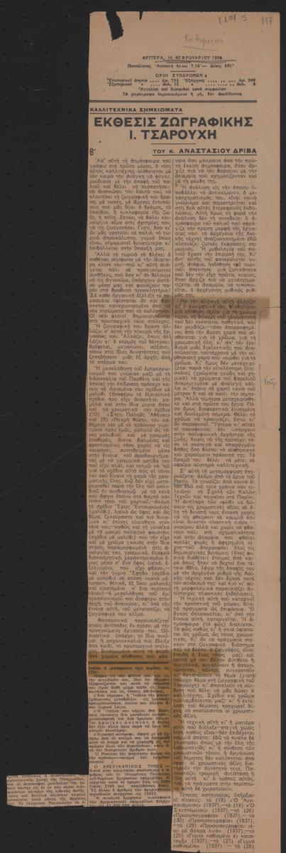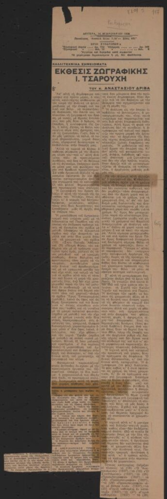 A clipping from the newspaper “I Kathimerini”, dated February 14, 1938, featuring a review of the exhibition by the Greek painter Yannis Tsarouchis.