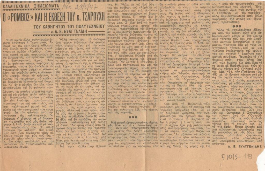 A clipping from the newspaper “Ta Nea”, dated May 29, 1947, featuring a review of the exhibition by the Greek painter Yannis Tsarouchis, at the Rhombus Gallery in Athens.