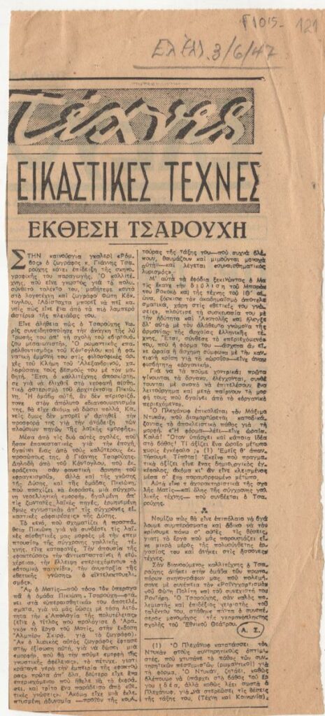 A clipping from the newspaper “Elefthei Ellada”, dated June 3, 1947, featuring a review of the exhibition by the Greek painter Yiannis Tsarouchis, at the Rhombus Gallery in Athens. The artistpresents part of his scenographic work.