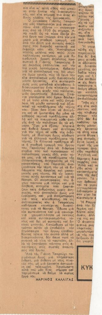 A clipping from the newspaper “To Vima”, dated June 13, 1947, featuring a review of the exhibition by the Greek painter Yannis Tsarouchis at the Rhombus Gallery in Athens, where the artist presents part of his scenographic work.