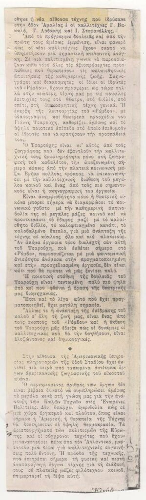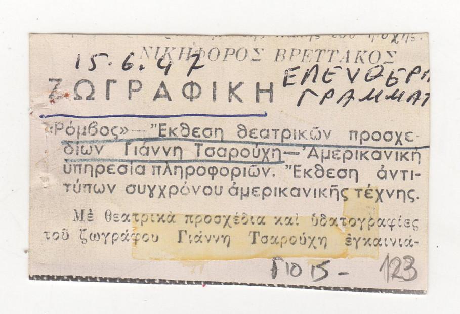 Nikos Engonopoulos (1907 - 1985) ; Spiteri-Veropoulou Ioanna (1920 - 2000) ; Vassiliou Spyros (1902 - 1985) ; Achilleas Aperghis (1909 - 1986) ; Gaitis Yannis (1923 - 1984) ; Panayiotis Gravalos (1933 - 2015) ; Konstantinos Grammatopoulos (1916 - 2003) ; Varlamos Giorgos (1922 - 2013) ; Katsoulidis Takis (1933) ; Μάριος Λοβέρδος ; Malamos Kostas (1913) ; Manousakis Giorgos (1914 - 2003) ; Georgios Mavroidis (1912 - 2003) ; Malamou-Mitsea Ioanna (1913 - 2004) ; Iris Drakouli (1929)