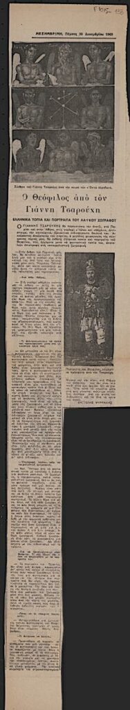 A clipping from the newspaper “Mesimvrini”, dated December 30, 1965, featuring an interview with the Greek painter Yannis Tsarouchis, on the occasion of his future exhibitions at the “Merlin” and “Iolas’ galleries in Athens and Paris.
