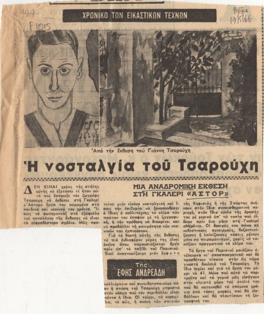 A clipping from the newspaper “To Vima”, dated May 13, 1966, featuring a review of the exhibition by the Greek painter Yannis Tsarouchis at the “Astor” Gallery in Athens, where he presents works from his earlier production.