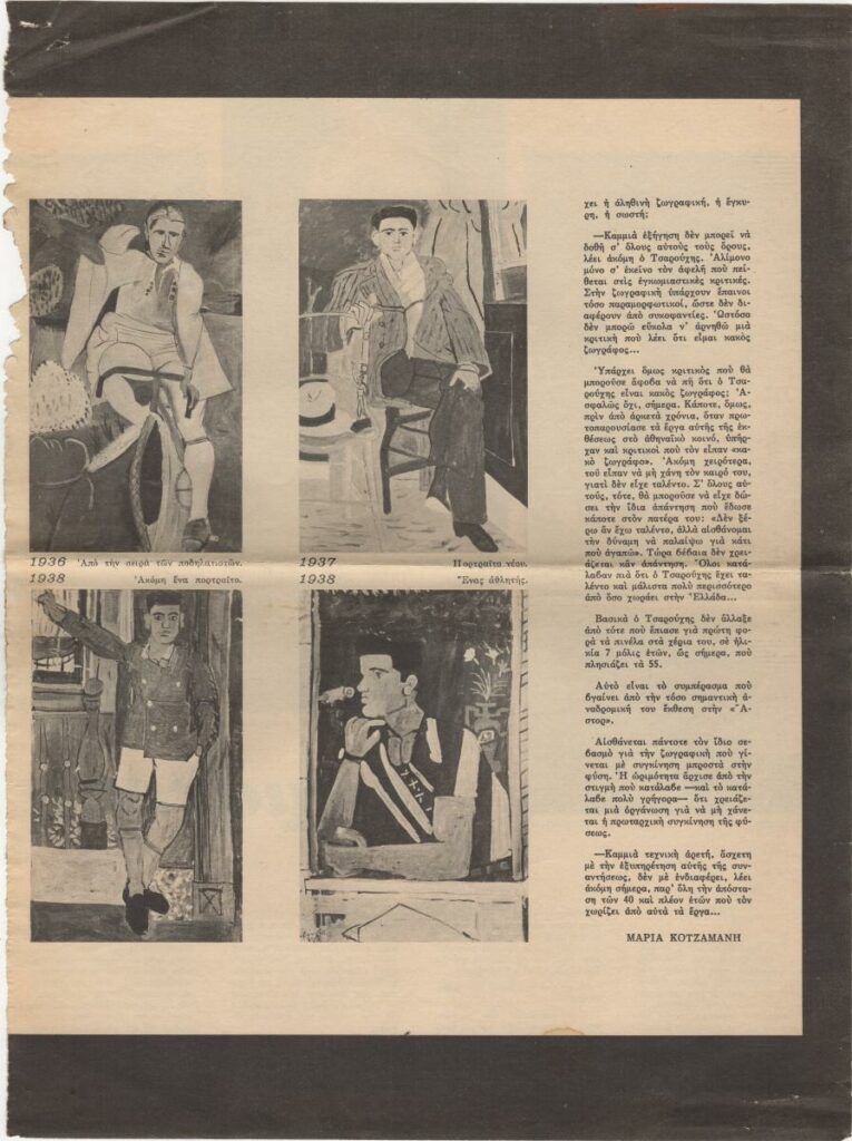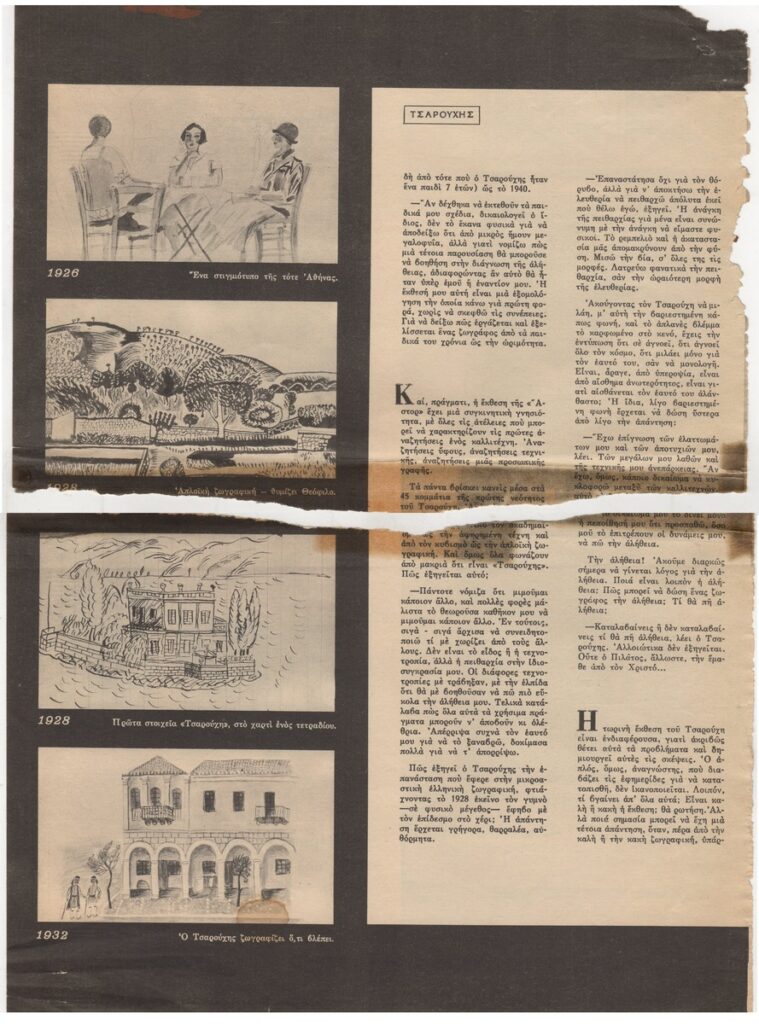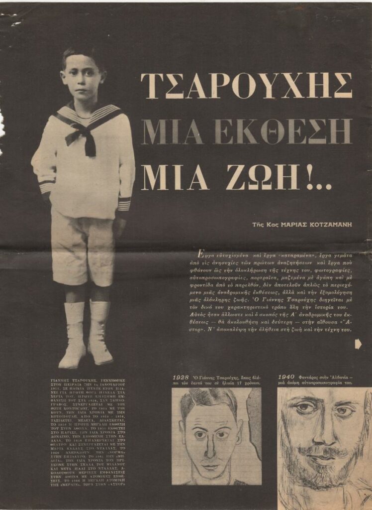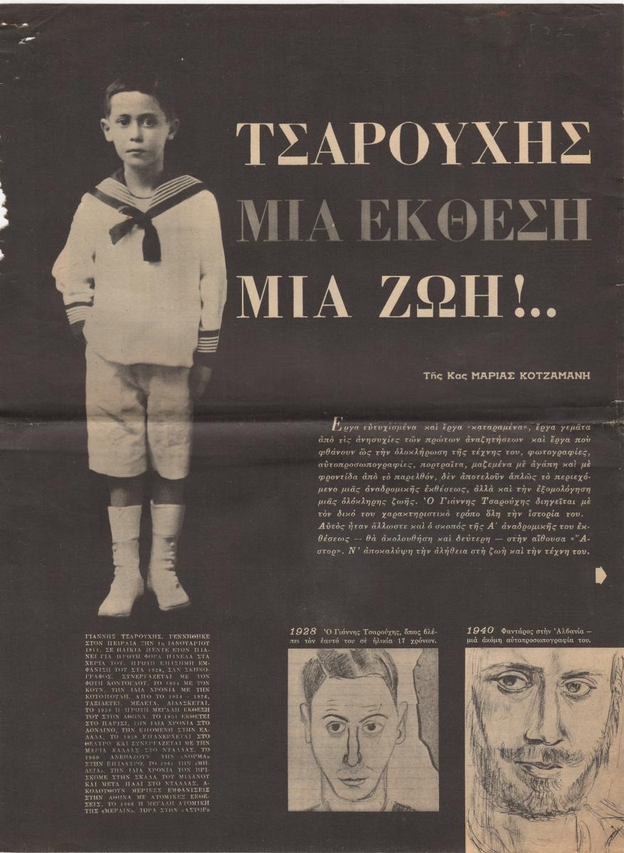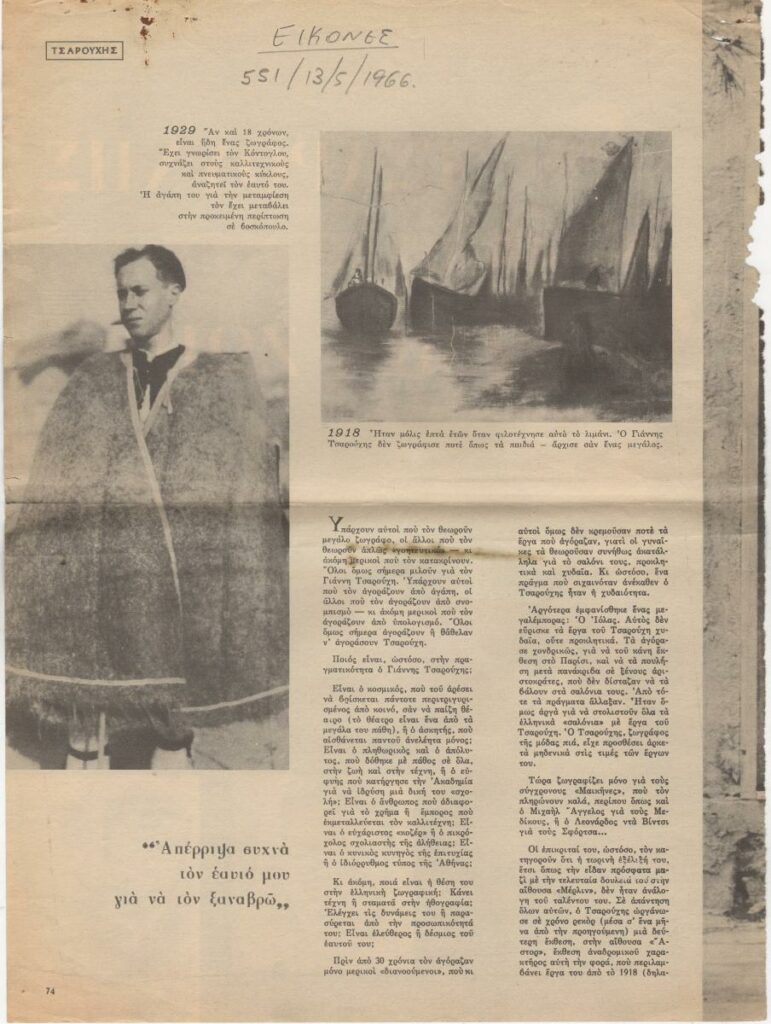 A clipping from the magazine “Eikones”, issue 555, dated May 13, 1966, featuring a review of the exhibition by the Greek painter Yannis Tsarouchis, held at the “Astor” Gallery in Athens. The article discusses his overall body of visual work and includes excerpts of his opinions.