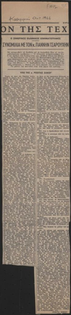 A clipping from the newspaper “I Kathimerini”, dated October 1966, featuring an interview with the Greek painter Yannis Tsarouchis about Greek cinema, on the occasion of the artist’s participation as a member of the jury of the Thessaloniki Film Festival.