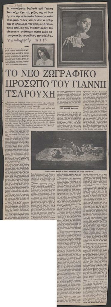 A clipping from the newspaper “I Kathimerini”, dated January 19, 1975, featuring an article about the most recent work of Greek painter Yannis Tsarouchis, after the restoration of the Republic in Greece, and the influences of political developments on his work.