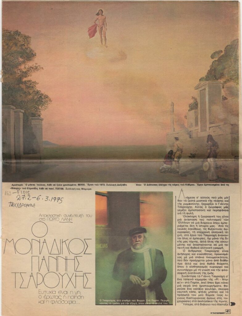 A clipping from the magazine “O Taxydromos’, dated February 27, 1975, featuring an interview with the Greek painter Yannis Tsarouchis. The artist talks about his work, politics, Greek dictatorship and writing.