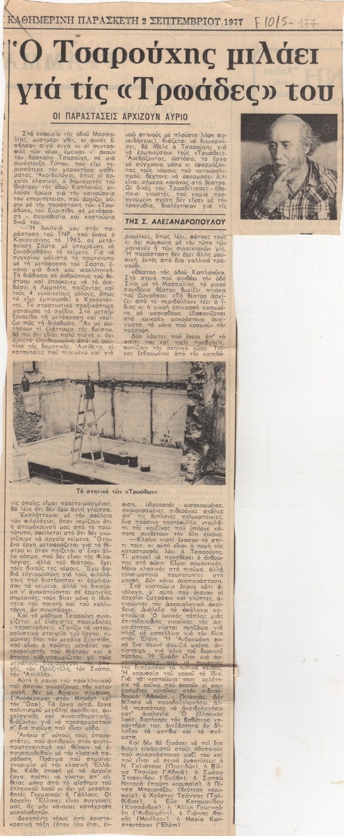 A clipping from the newspaper “I Kathimerini”, dated September 2, 1977, featuring an article that conveys the thoughts of Greek painter Yannis Tsarouchis about the staging Euripides’ play “The Trojan Women” in Athens.