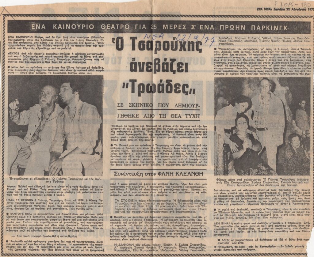 A clipping from the newspaper “I Kathimerini”, dated September 22, 1977, featuring an interview with Yannis Tsarouchis, on the occasion of the staging of Euripides’ play “The Trojan Women” in Athens.