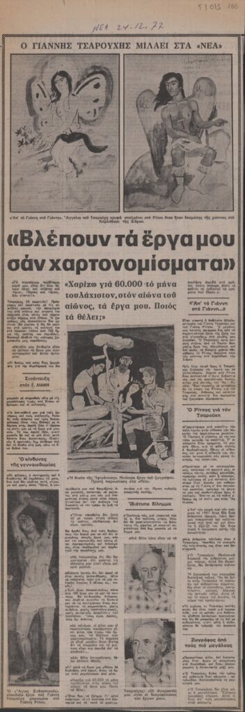 A clipping from the newspaper “Ta Nea”, dated December 24,1977, featuring an interview with Greek painter Yannis Tsarouchis. The artist expresses his frustration with the public’s preoccupation with the value of his artwork. He also speaks about his appreciation for poet Yannis Ritsos.