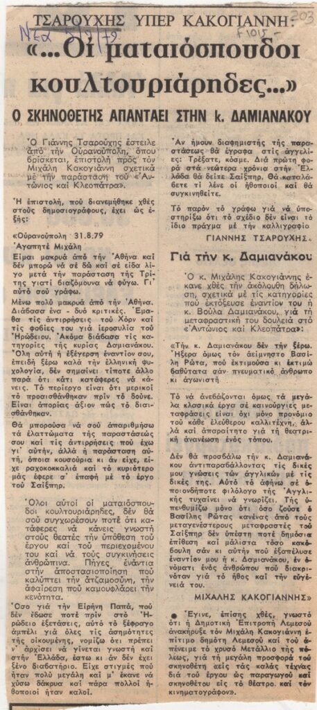 A clipping from the newspaper “Ta Nea”, dated September 5, 1979 featuring a response from Yannis Tsarouchis in a letter he sent to Mihalis Kakogiannis regarding his staging of the play “Antony and Cleopatra”. The clipping also includes a statement from Mihalis Kakogiannis addressing accusations from Voula Damianakou regarding the translation of the work.