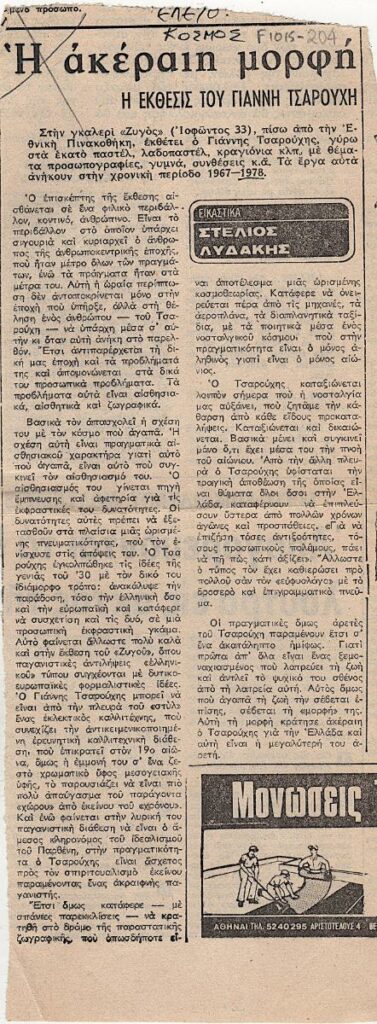 A clipping from the newspaper “Eleftheros Cosmos”, featuring a review of the exhibition by Yannis Tsarouchis, at the Zygos Gallery in Athens.