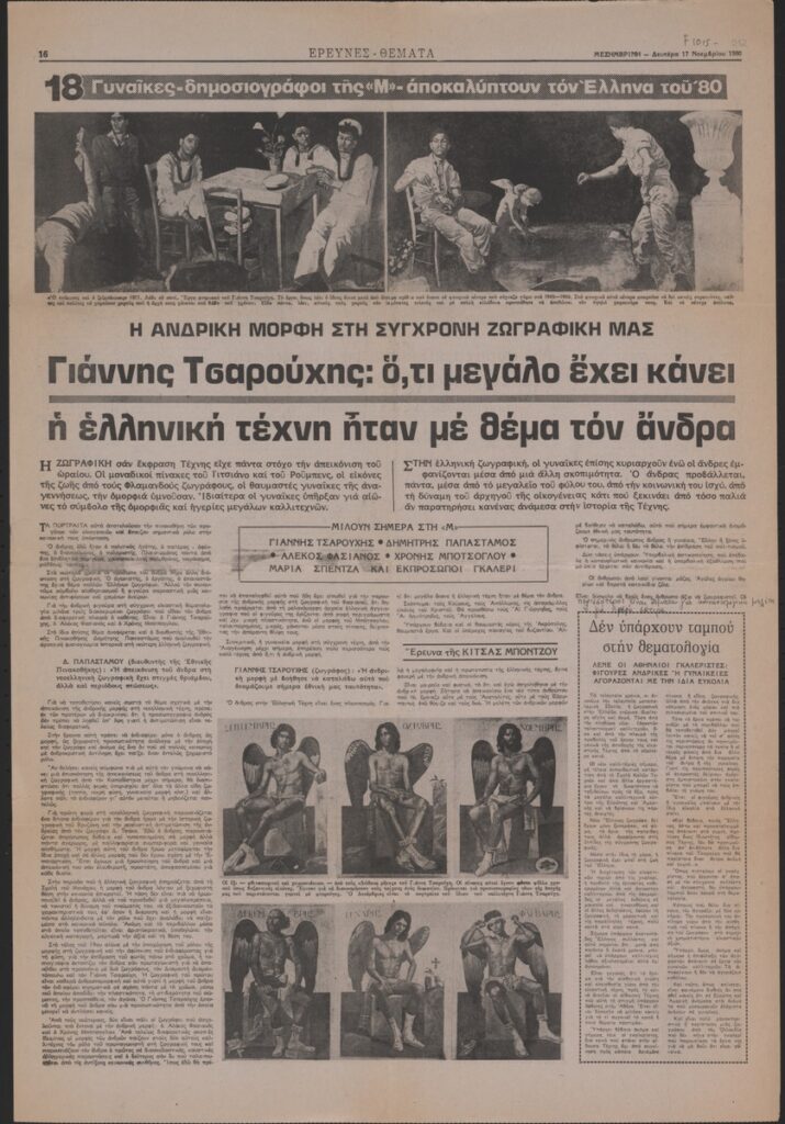 A clipping from the newspaper “Mesimvrini,”, dated November 17, 1980, presents an article on the depiction of male figures in Greek painting. The article conveys the views of Tsarouchis, Papastamos, Fassianos, and Botsoglou.
