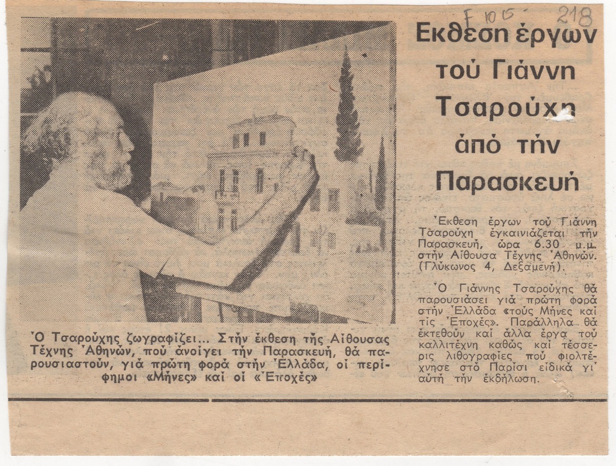A newspaper clipping, dated December 1980, featuring the announcement of an exhibition by Yannis Tsarouchis at the “Athens Art Gallery”.